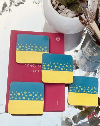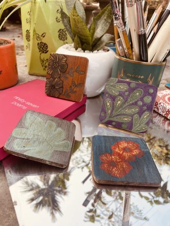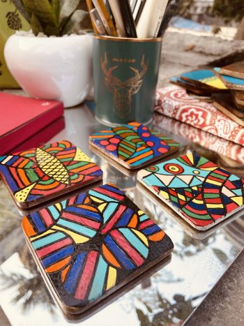Pannchi Strip Coaster-Wood Colour ,Red & Yellow Strips